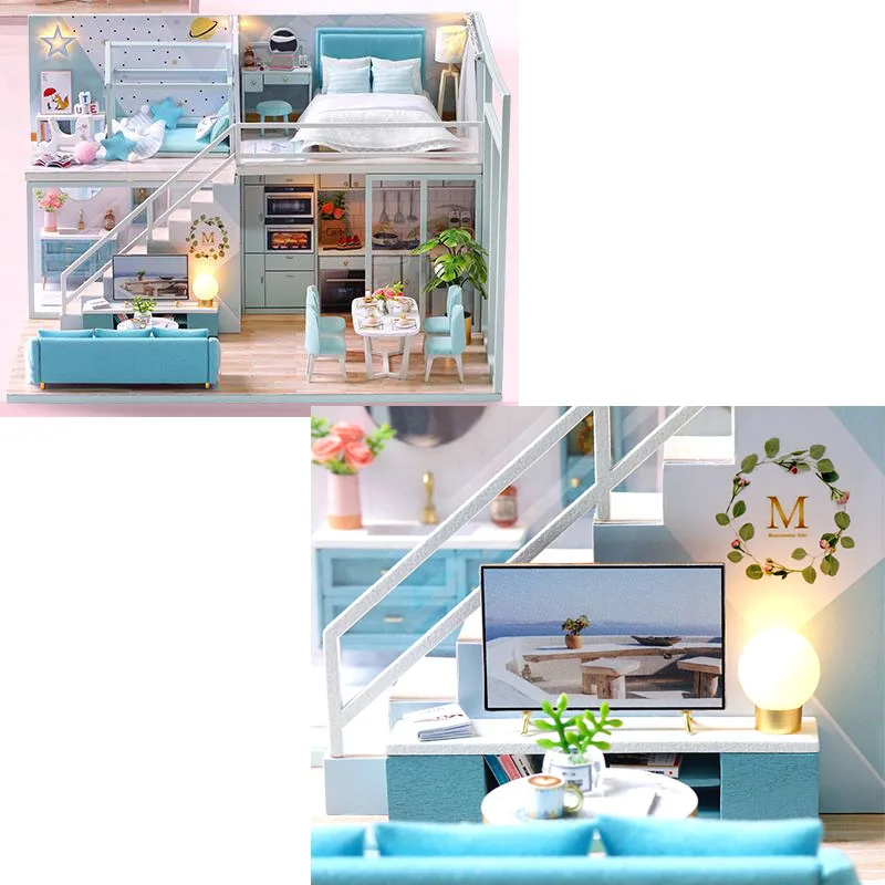 Miniature Loft Dollhouse Children Bedroom Kitchen Furniture LED Lights Kit Assembly Wooden Puzzle T